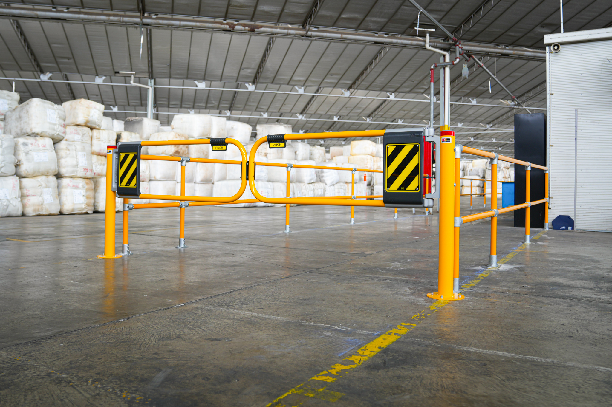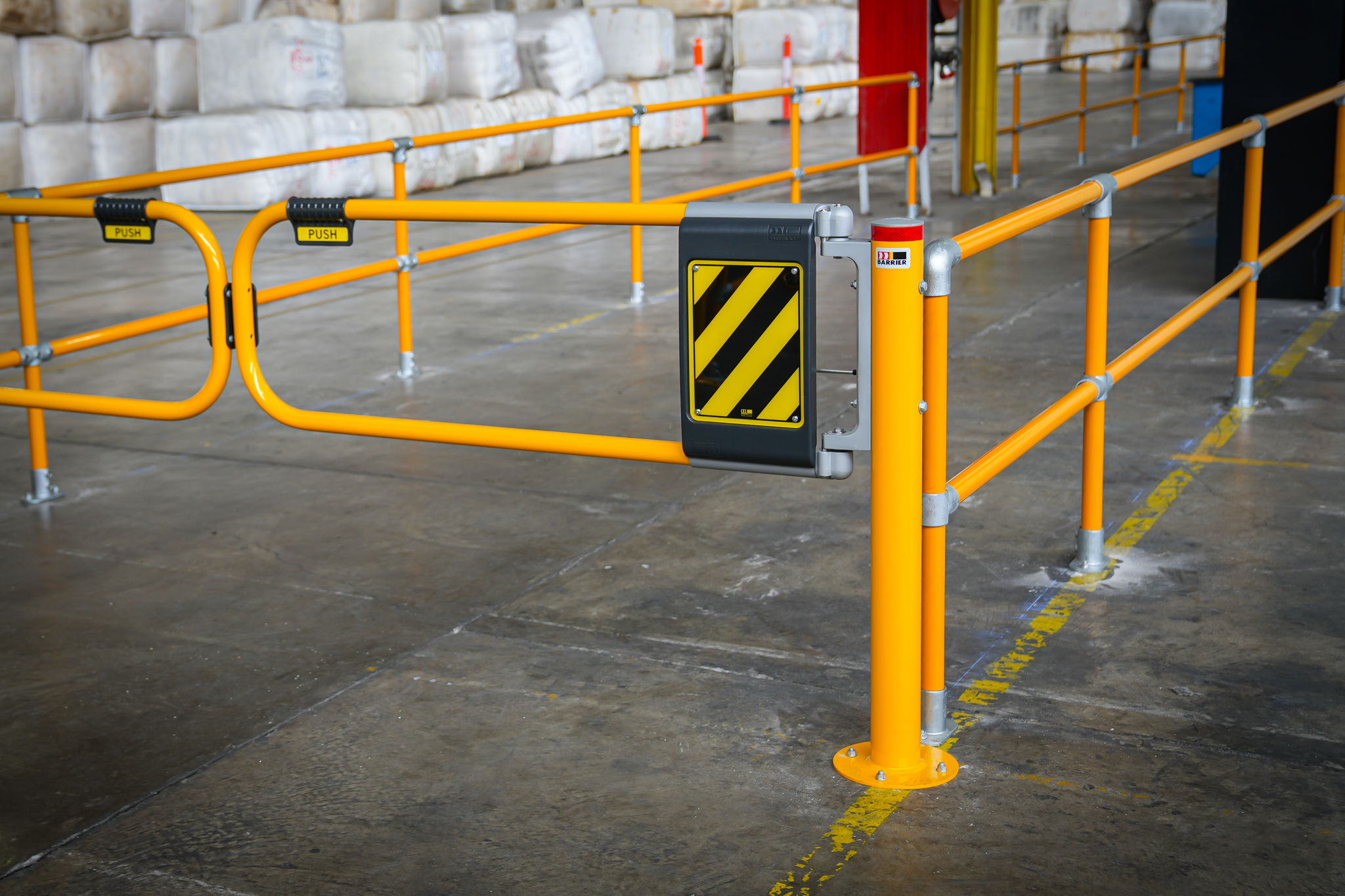 Ball-Fence Industrial Swing GatesHigh-visibility Ball-Fence Industrial Swing Gates were installed at all key pedestrian entry and exit points to reinforce controlled movement along designated walkways. Both single and double gate configurations were used to accommodate standard and wide access requirements. Our installation team adjusted the tension on the double gate configurations, ensuring the latch-side gate closed last for a consistently secure seal.