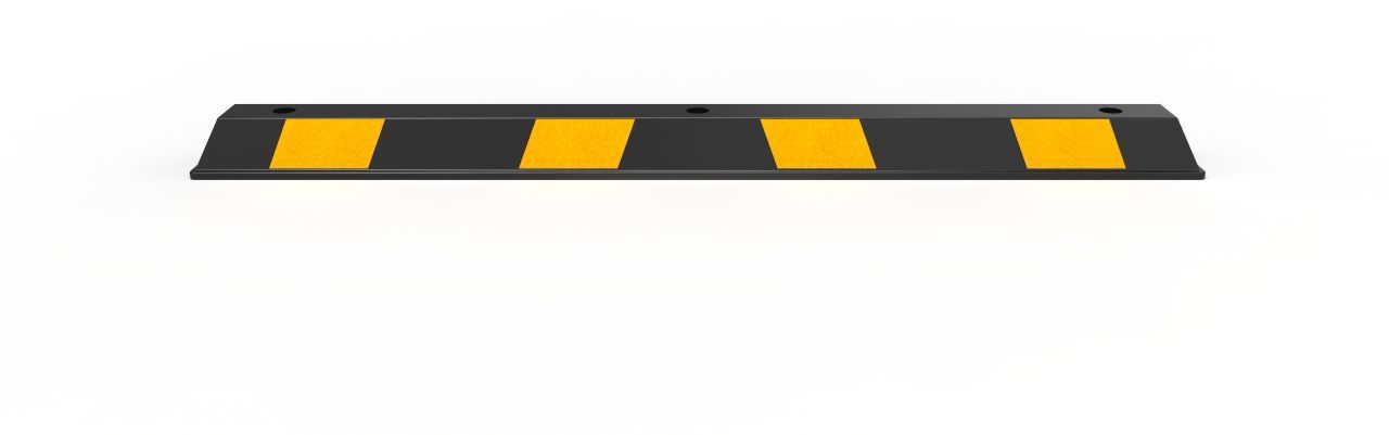 Description: Recycled rubber wheel stop. Material: Recycled and natural rubber. Finish: Solid Black rubber in a choice of Hi-Vis Yellow or Green or Blue panels. Length: 1650mm. Width: 160mm. Height: 100mm. Weight: 12kgs. Fixings: 3 x 150mm Masonry anchors (gravel spikes optional). -
